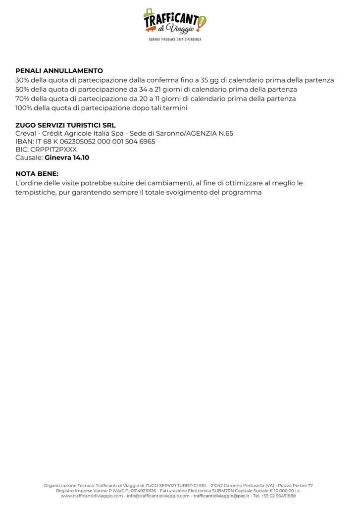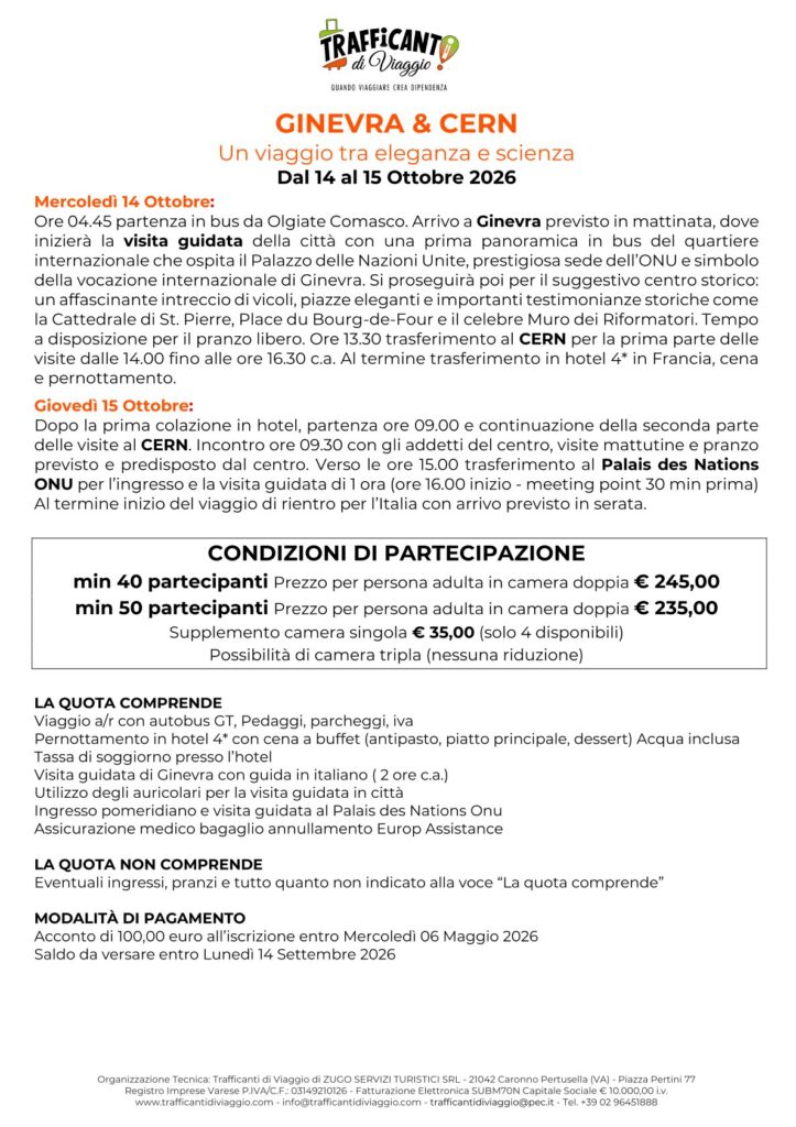 Come spiegato dettagliatamente nel programma allegato, il viaggio si svolgerà in 2 giorni per consentire non solo una visita approfondita del Centro Scientifico sotto la guida di esperti, ma anche per fare un tour guidato della città di Ginevra, con ingresso al Palais des Nations-ONU.