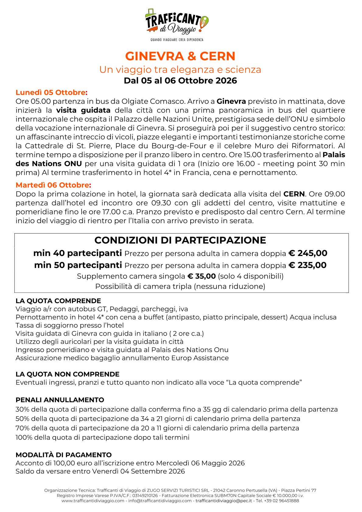Come spiegato dettagliatamente nel programma allegato, il viaggio si svolgerà in 2 giorni per consentire non solo una visita approfondita del Centro Scientifico sotto la guida di esperti, ma anche per fare un tour guidato della città di Ginevra, con ingresso al Palais des Nations-ONU.